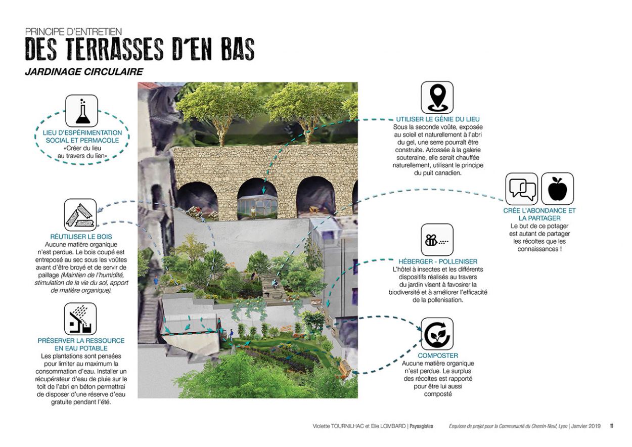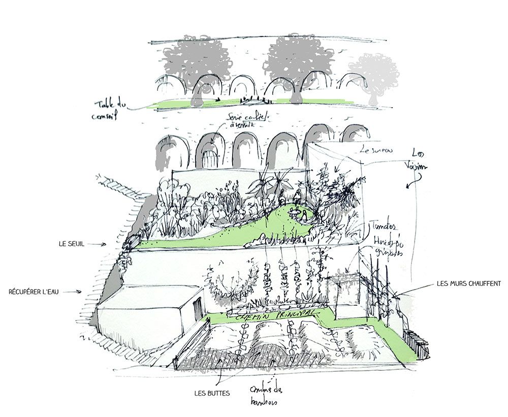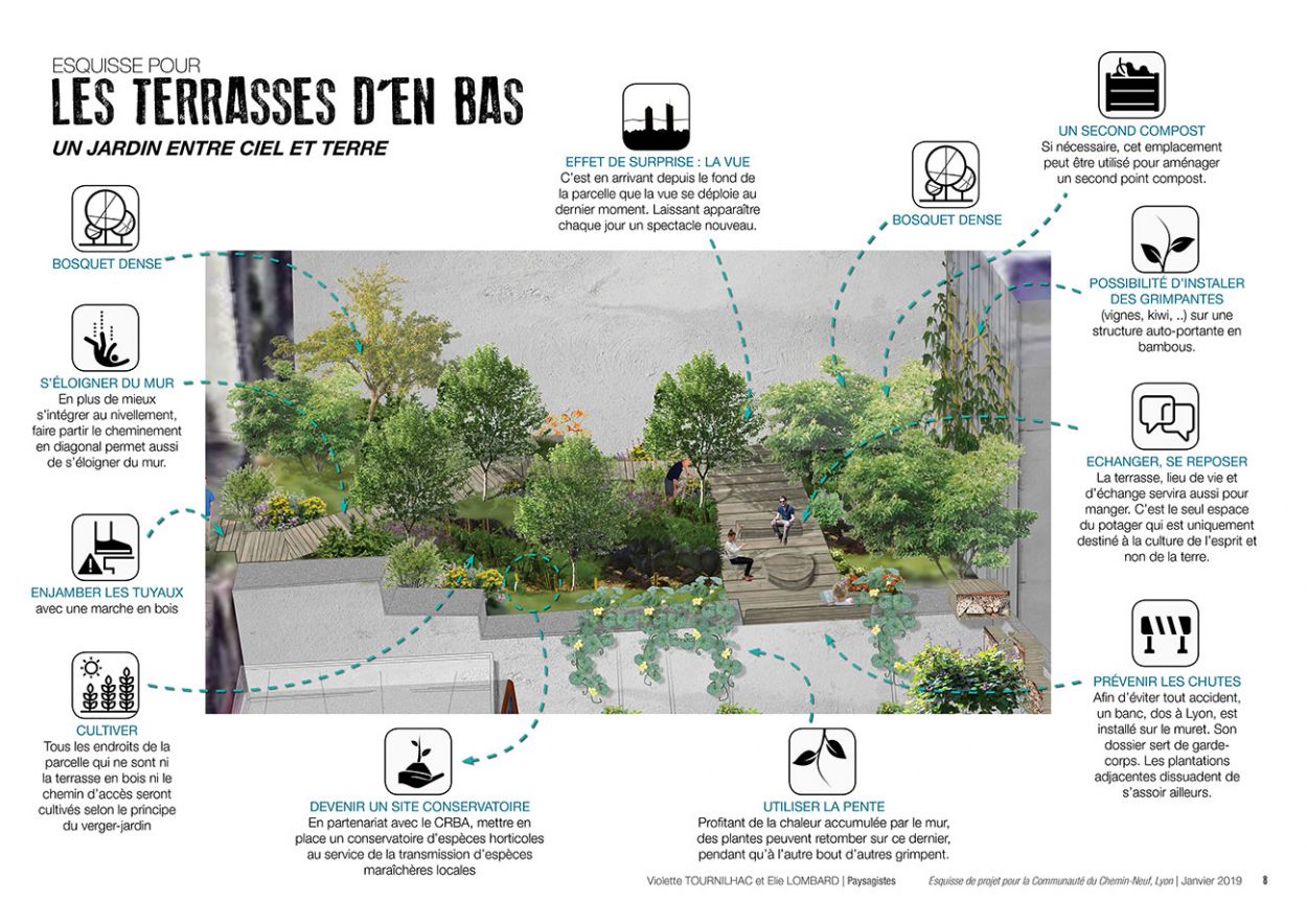 Après avoir exposé le potentiel des lieux aux jardiniers ainsi qu’aux propriétaires, j’ai proposé les grandes lignes d’un projet adapté au potentiel exceptionnel du site : non seulement entretenir ces terrasses en friche, mais dépasser la commande initiale et créer un vrai lieu de partage, de transmission et d’éveil à l’écologie. Un lieu regroupant et incarnant les valeurs portées par les propriétaires.