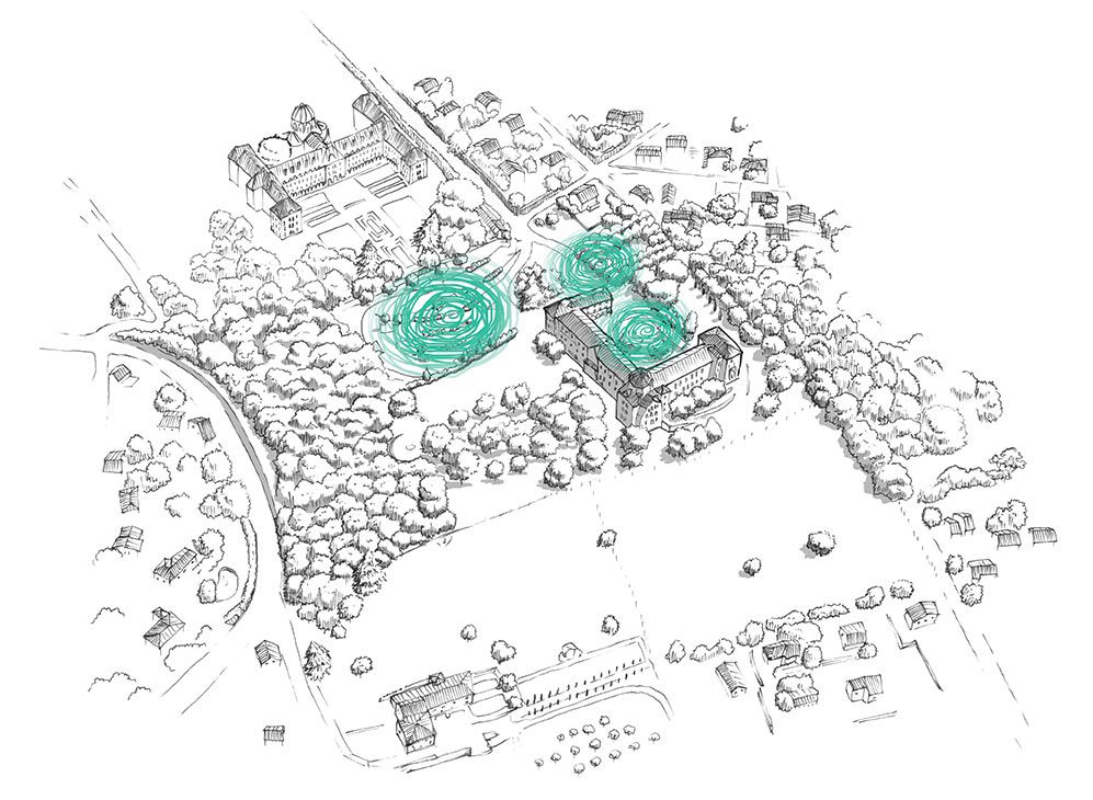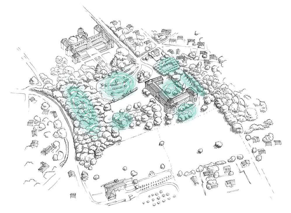 Cette étude propose un parcours balisé, invitant le visiteur à la promenade, et lui permettant de vivre une expérience sensible et spirituelle grâce au calme et à la beauté des lieux. Par un cheminement piétonnier lisible et qualitatif, le visiteur sera conduit à travers différents endroits du Parc, lui révélant ainsi tout son potentiel. Chaque ambiance végétale mets le visiteur dans un état émotionnel particulier, le touche par sa beauté propre, l’amène à s’interroger sur lui-même, le dispose à recevoir un enseignement. Le secret de l’art des jardins réside dans l’équilibre entre la précision du dessin (allées, massifs, nivellement, etc.) et l’organicité fluctuante de la végétation. Cet équilibre entre nature et culture est souvent renforcé par l’ajout de points d’attrait tel que les statues, les folies, les pontons, les belvédères, dynamisant le parcours et créant la surprise. Tout cheminement à travers un parc est aussi affaire de rythme. Cet itinéraire à travers le Parc du Domaine propose un voyage initiatique.